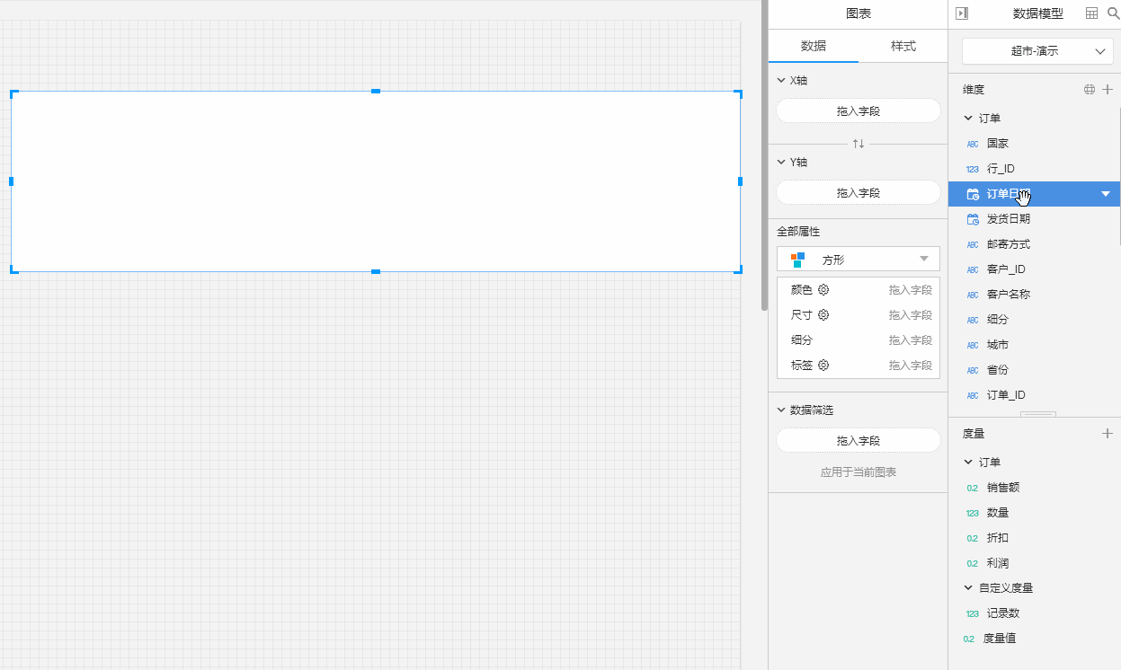 2.将订单日期字段拖入Y轴,将地区字段拖入X轴。