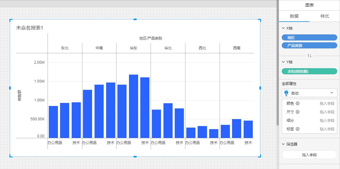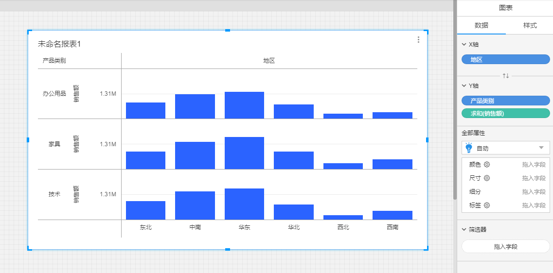 将涉及到3个字段: 维度地区,维度产品类别,度量销售额