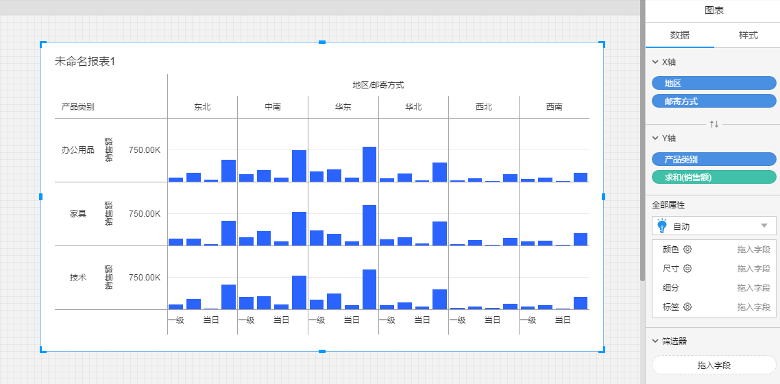 将涉及到4个字段: 维度地区,维度产品类别,维度邮寄方式,度量销售额