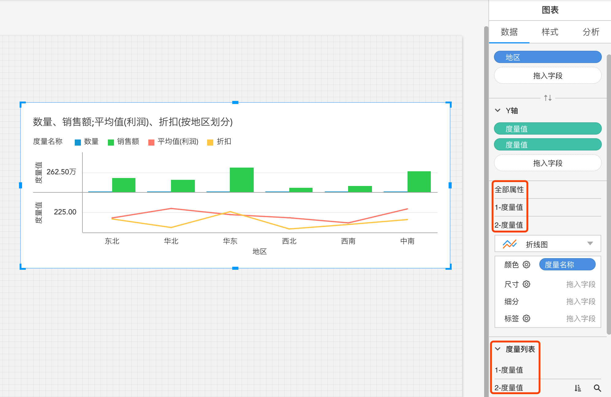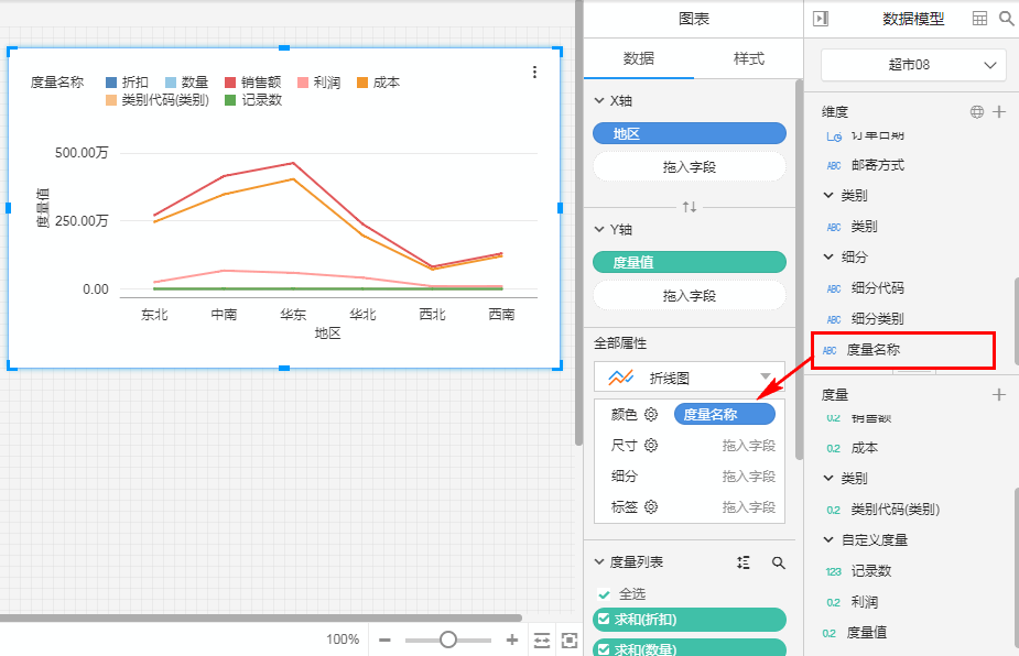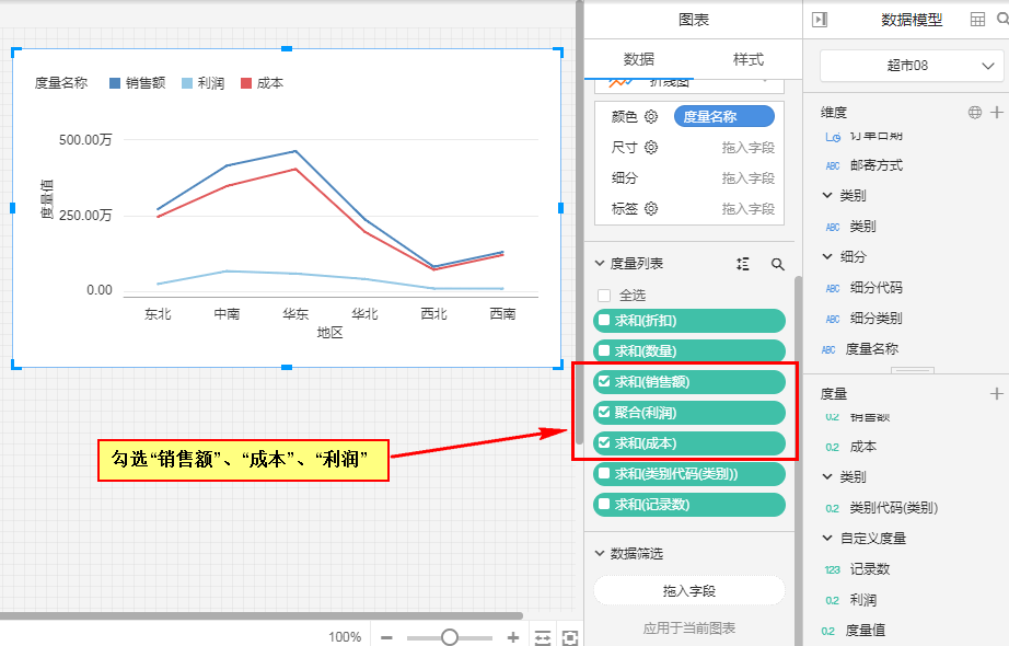 step3:在度量列表中勾选需要显示的度量,这里我们勾选销售额、成本、利润,即完成了多度量图的绘制。