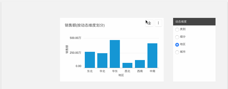 如图所示,将已创建的区域层级字段拖入动态维度面板,点击确认,预览界面动态维度切换到地区时,可进行点击下钻,上卷等操作。