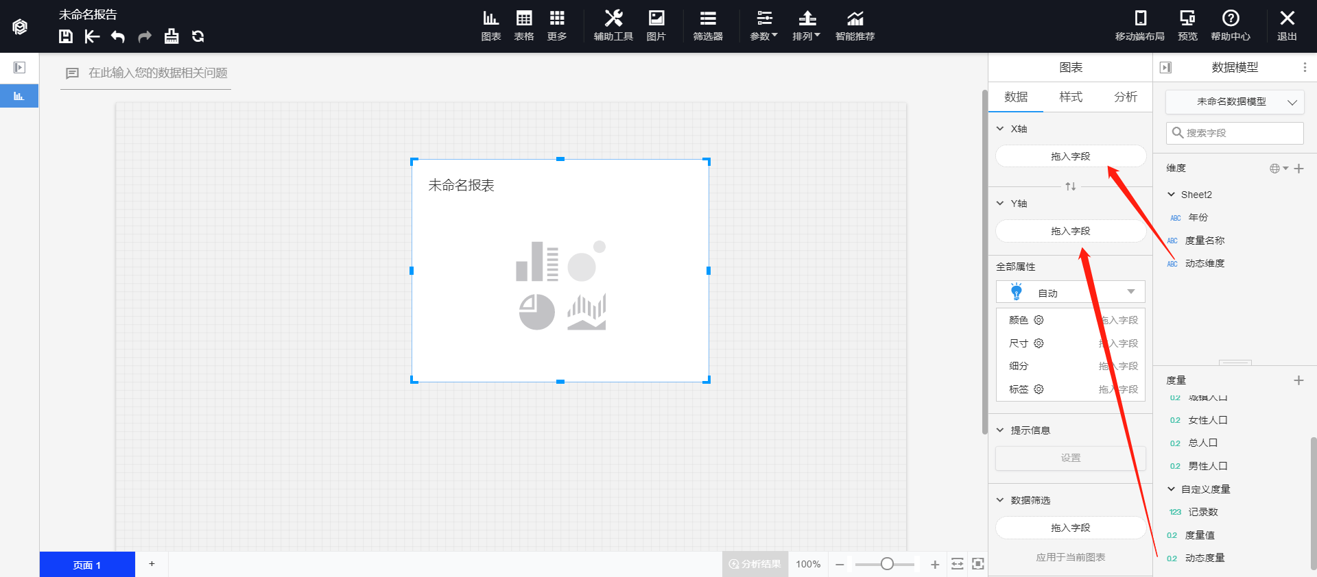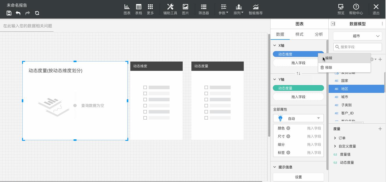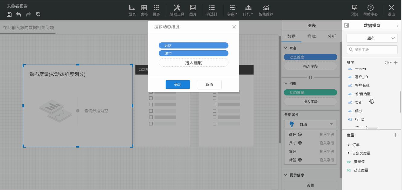 新增动态维度和动态度量图表控件,更加简单快速地实现多维度或多指标的切换,具体操作如图所示。添加数据模型,插入图表控件后,将动态维度和动态度量分别拖入X轴和Y轴。