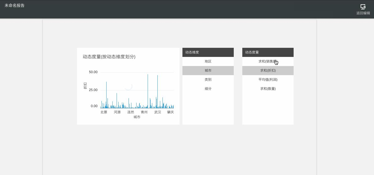 然后依次编辑动态维度和动态度量,拖入维度和度量,即完成动态维度和度量的编辑。预览可见,能够快速切换不同的维度和度量。详见下图。