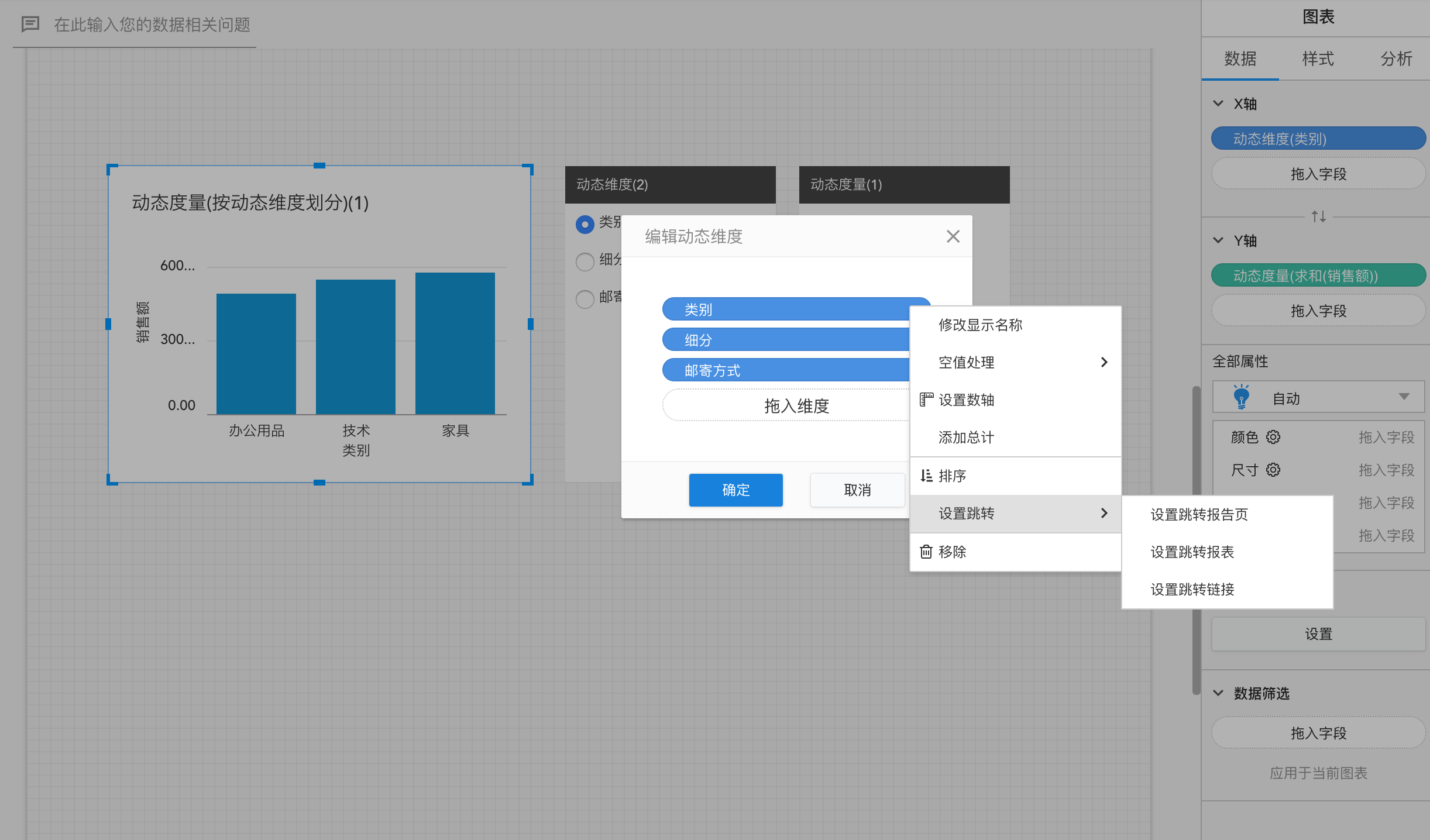 编辑动态维度/度量时,可分别对每个维度和度量pill设置跳转。