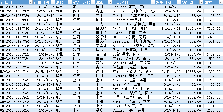 假设我们有一份明细的订单交易数据,部分数据如下: