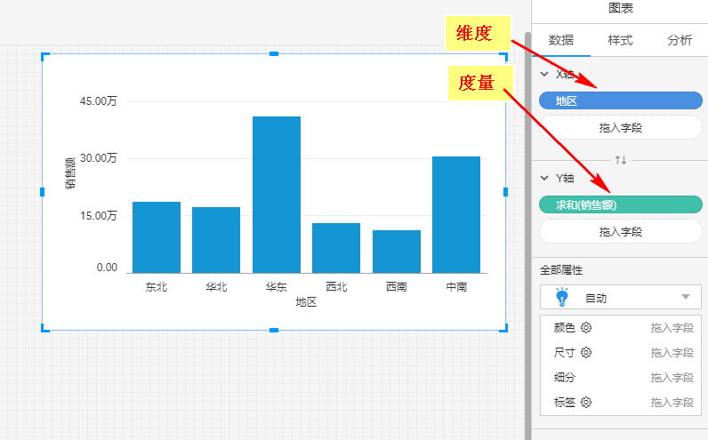 比如,观察“各地区的销售额”,“地区”是维度,“销售额”是度量。每个地区都对应成百上千行数据,平台对这些数据进行了求和汇总。如下图所示: