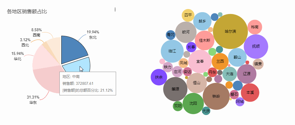 当在左侧饼图选中中南地区时,右侧气泡图将显示中南地区的城市,同理,左侧饼图选中华东地区时,右侧气泡图将显示华东地区的城市。