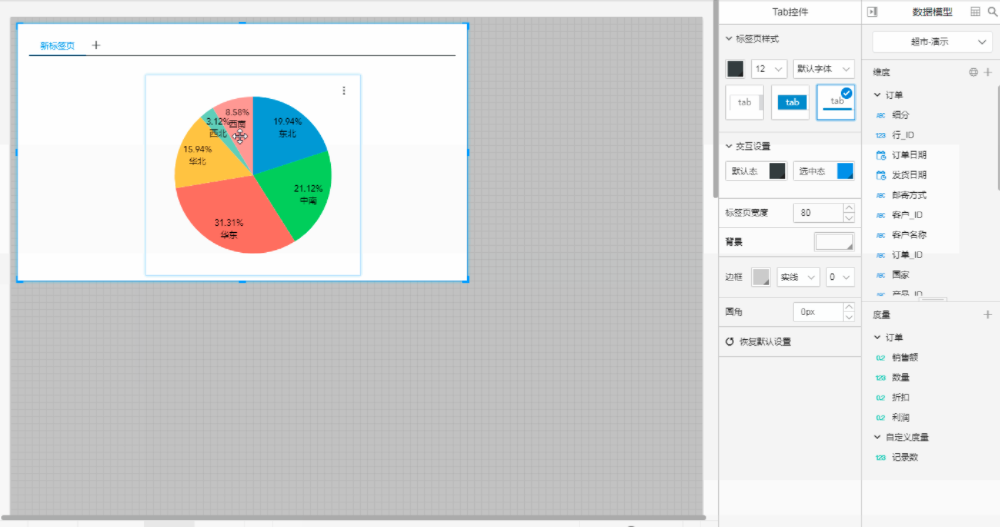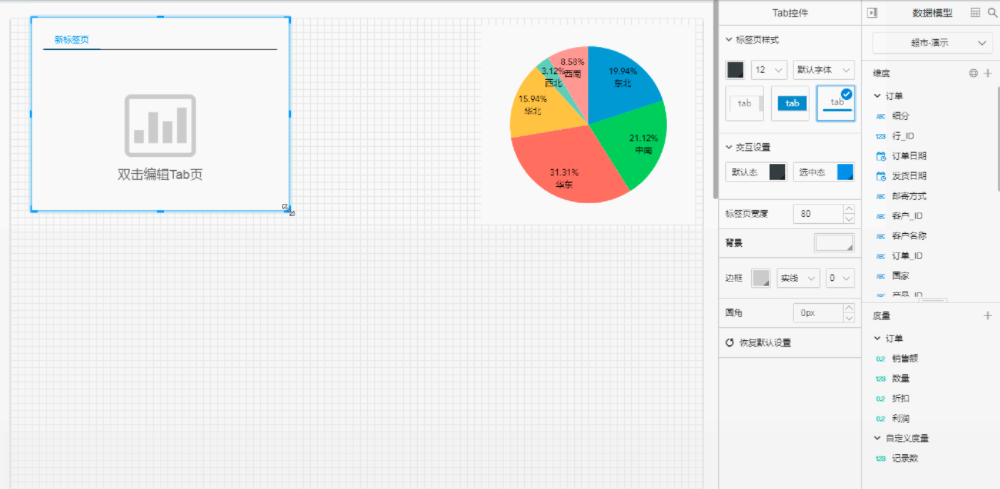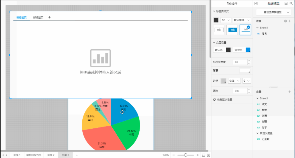 2.双击画布上的Tab控件,进入控件编辑状态,将其他图表拖入Tab控件(这里我们拖入一个饼图)。