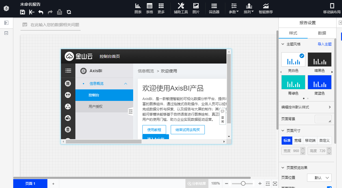 报告新增直线辅助工具,选择直线,画布中出现直线,可手动调节直线长度、方向,还可在样式面板修改直线的边框样式和大小。