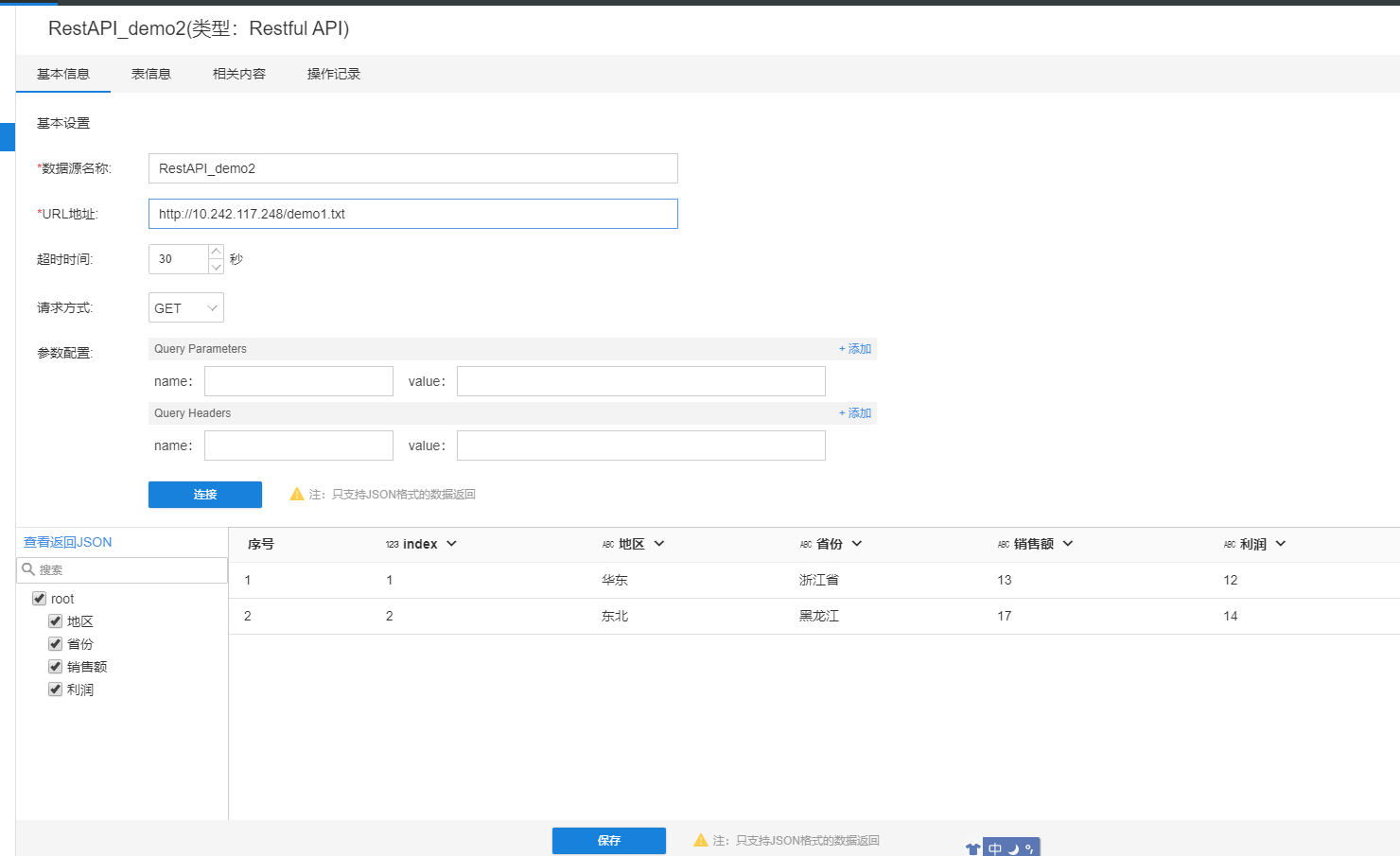 2.在商业智能分析上新建一个restful api的数据连接,将该请求放入商业智能分析中解析: