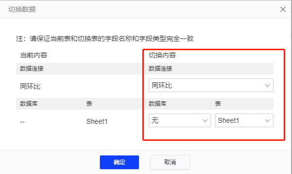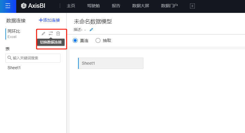 2.编辑模型界面,选择切换数据连接按钮,进入数据连接切换界面,选择目标数据源,点击确定即可切换。