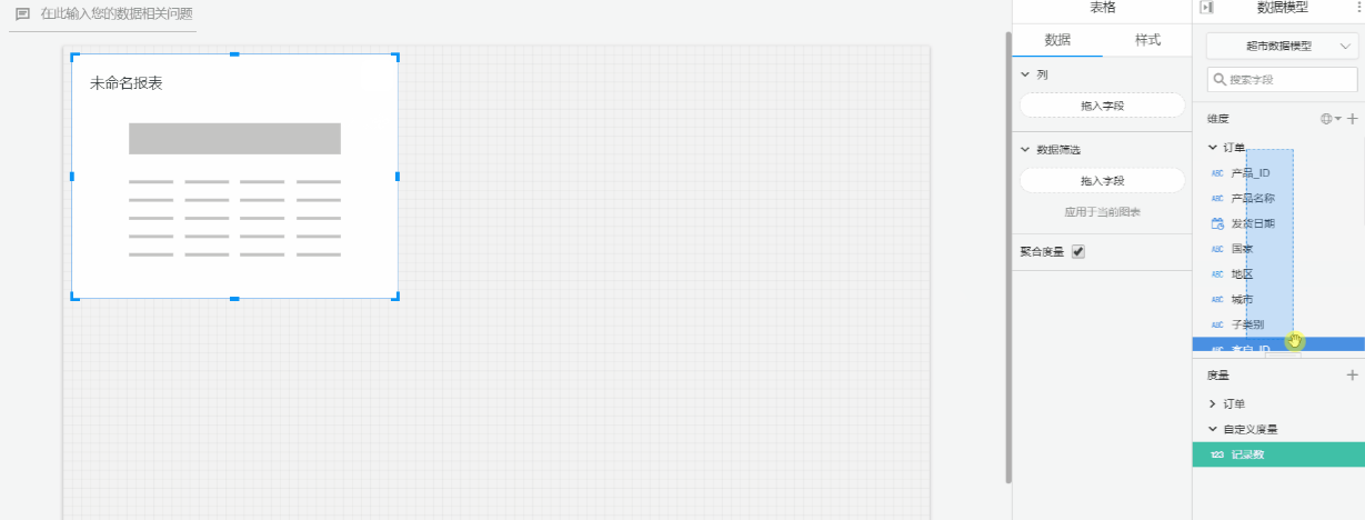 一般框选在自定义纬度和度量或者表名的空白处,比较容易选中,使用光标划过。或者按照shift键进行多选。