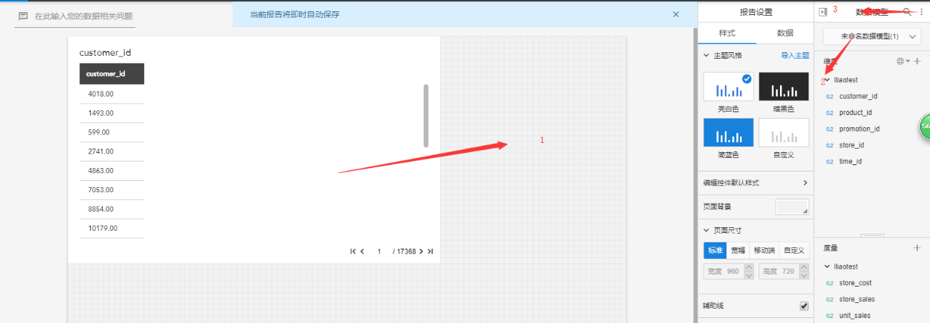 1.选中报表的1部分。报表的右边会自动做映射。右边的2是该图表的数据模型。