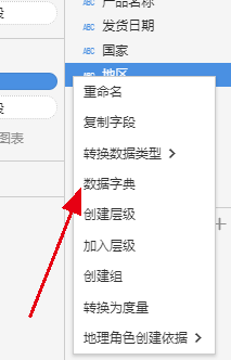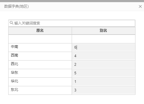 ①建立数据字典;比如下面这份数据,自然排序的结果是东北,西南,华东,西北,中南,华北这样的顺序,那么我现在想自定义排序,顺序是华北,西北,东北,西南,华东,中南(任意你要的顺序),那么只需要以[地区]这个维度,建立数据字典