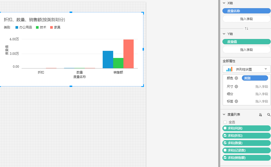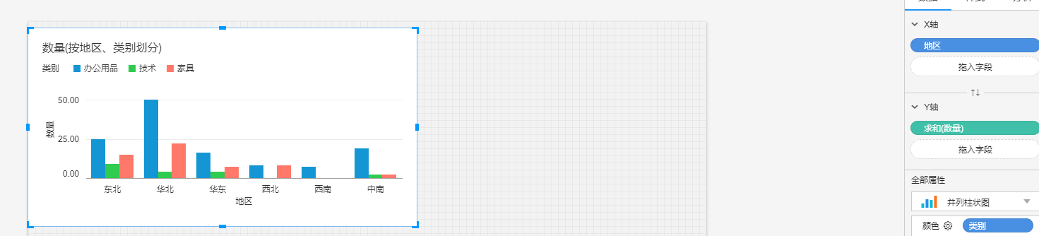 我们可以把地区放入X轴,销售额放入Y轴,颜色放入类别。然后选择并列状图就好了。