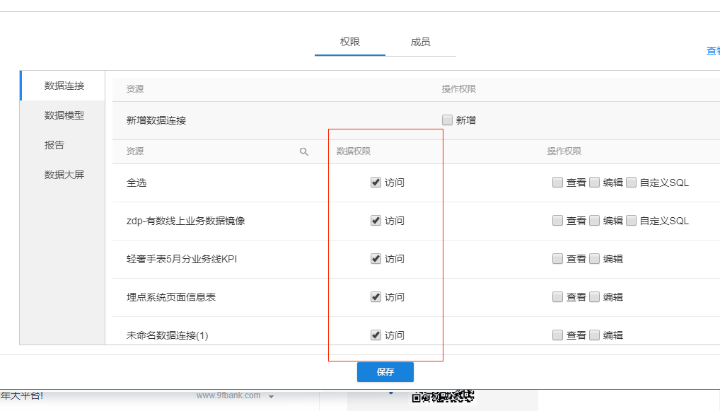 数据连接的权限有4中:1.访问;2查看;3编辑;4.自定义sql