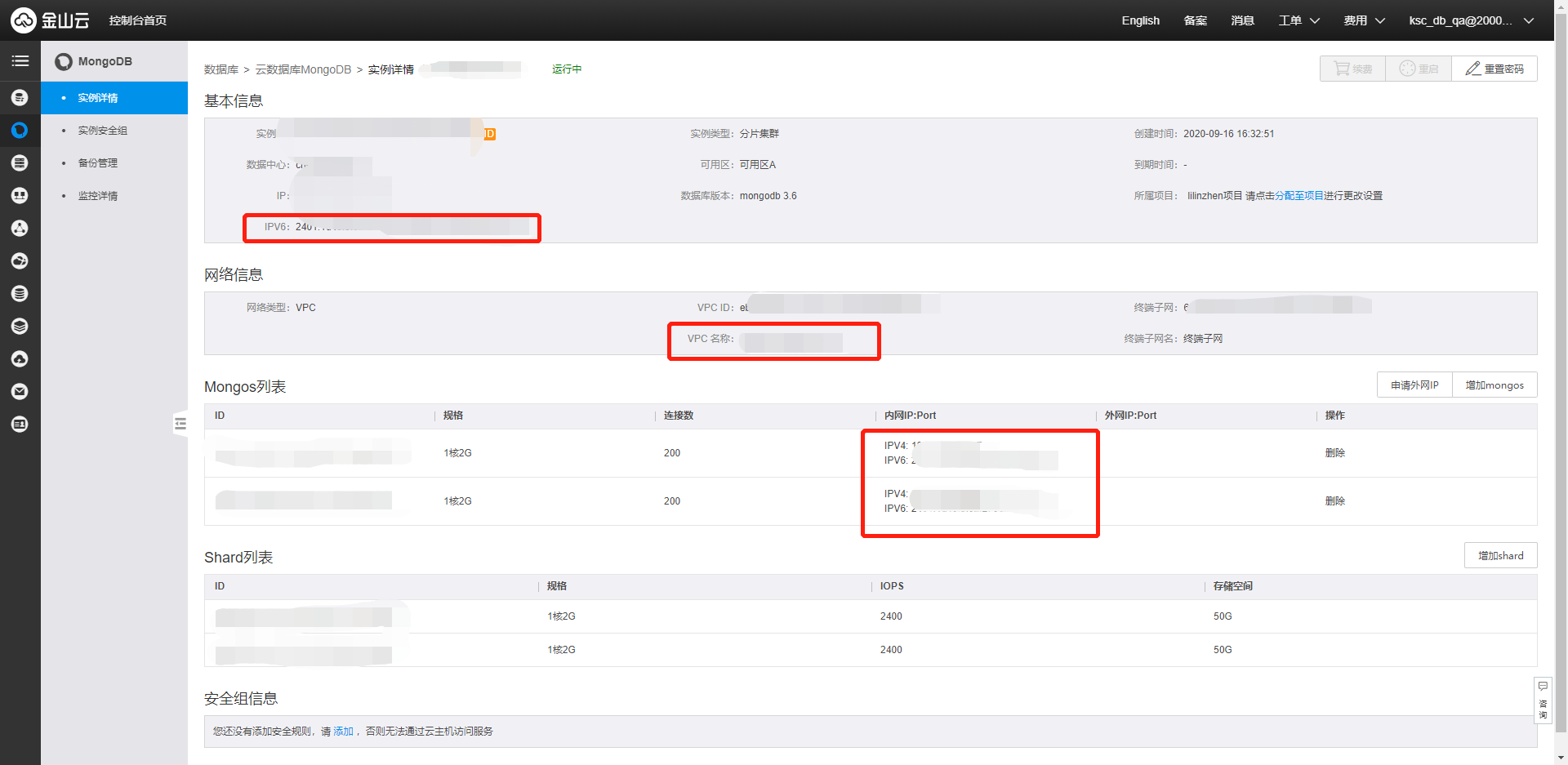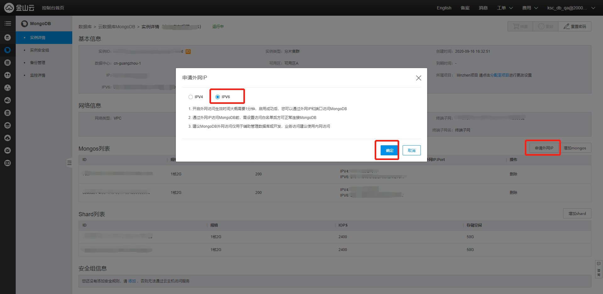 支持MongoDB集群实例内外网IPV6的连接,数据库安全组白名单支持IPV6模式。