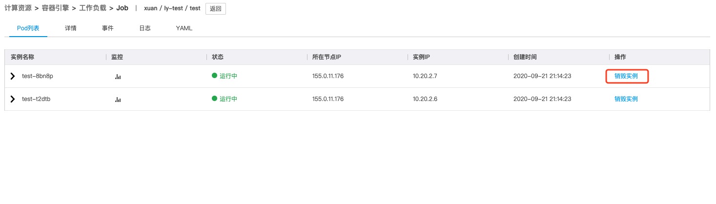 点击Job名称进入某个Job的详情页,在pod列表中点击销毁实例,即可删除某Job下的特定实例。