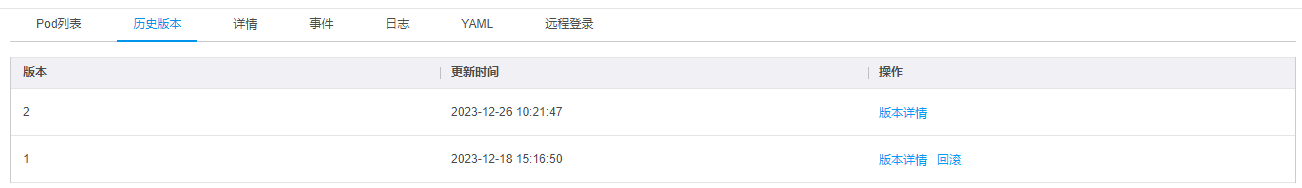在Deployment列表页面,点击Deployment名称,进入详情页。在Deployment详情页中,选择历史版本页签,即可查看Deployment历史版本。