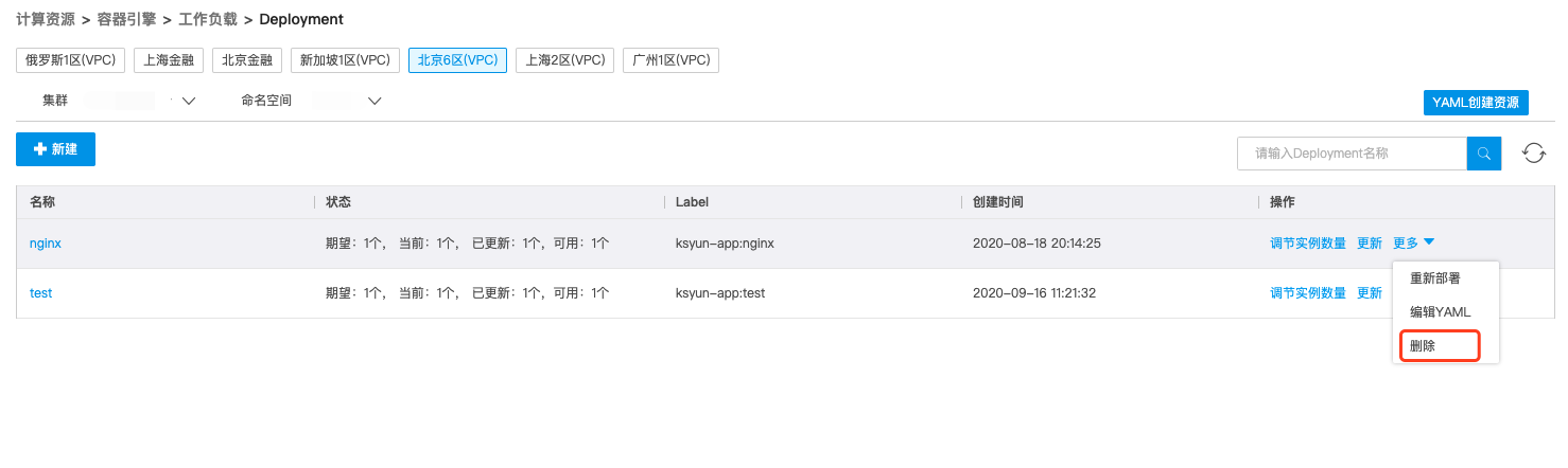 在Deployment列表页面,点击删除,执行删除Deployment的操作。