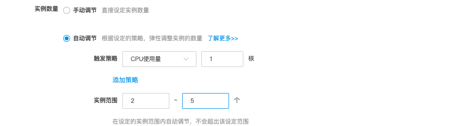 或选择自动调节,设置触发策略和实例范围,实现弹性调整实例的数量。