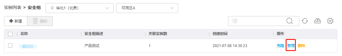 在安全组页面,点击列表中某安全组名称或点击管理,进入安全组管理页。