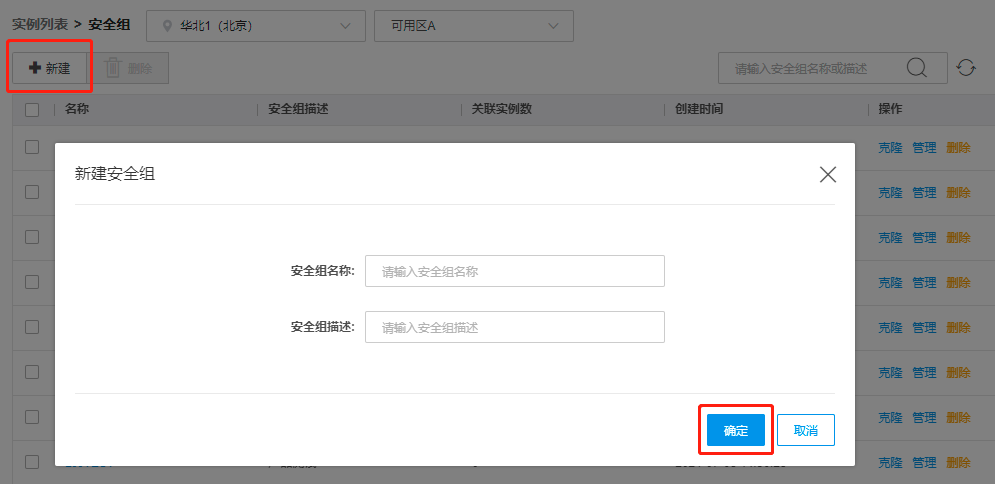 输入安全组名称和安全组描述,点击确认。