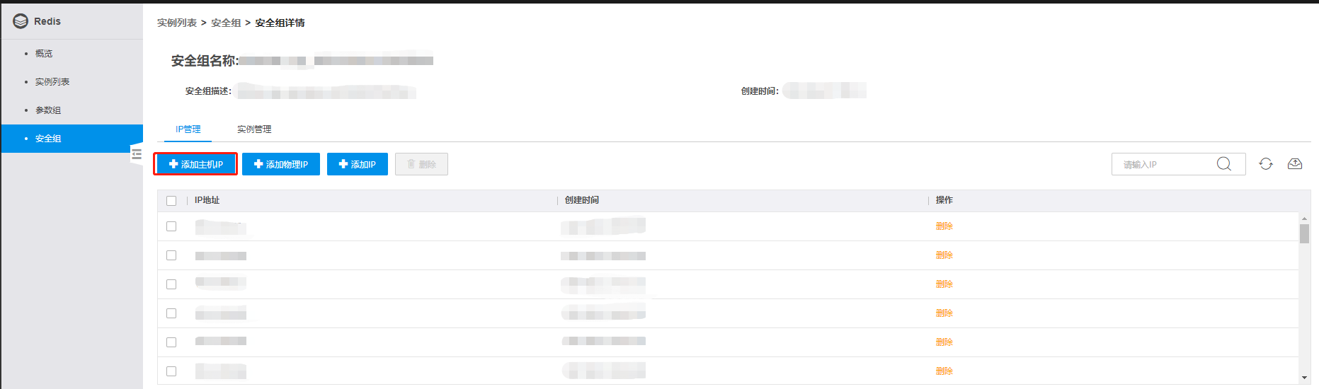 在安全组页面,点击要删除的实例或管理,进入安全组IP管理分页。