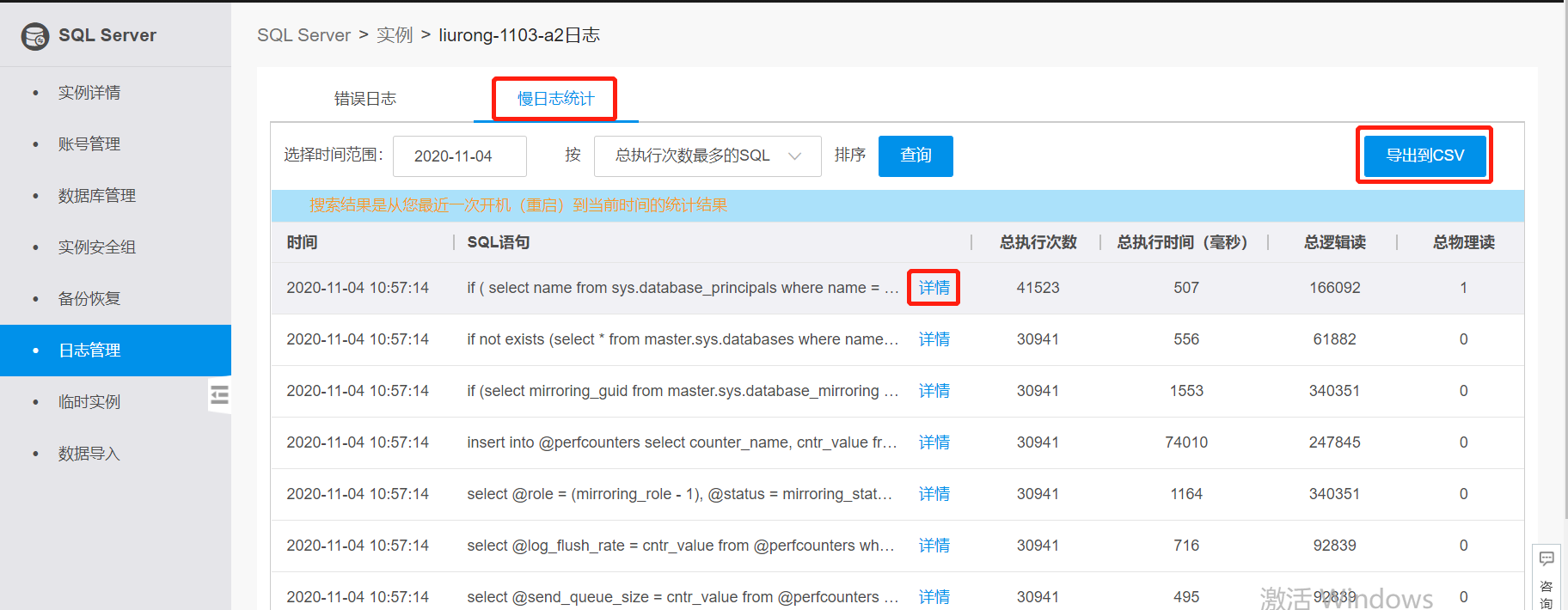 选择慢日志统计,进入该页面后,可通过施加范围或按总执行次数最多的SQL等进行排序查看,也可进行导出及查看该“慢日志统计”的详情信息