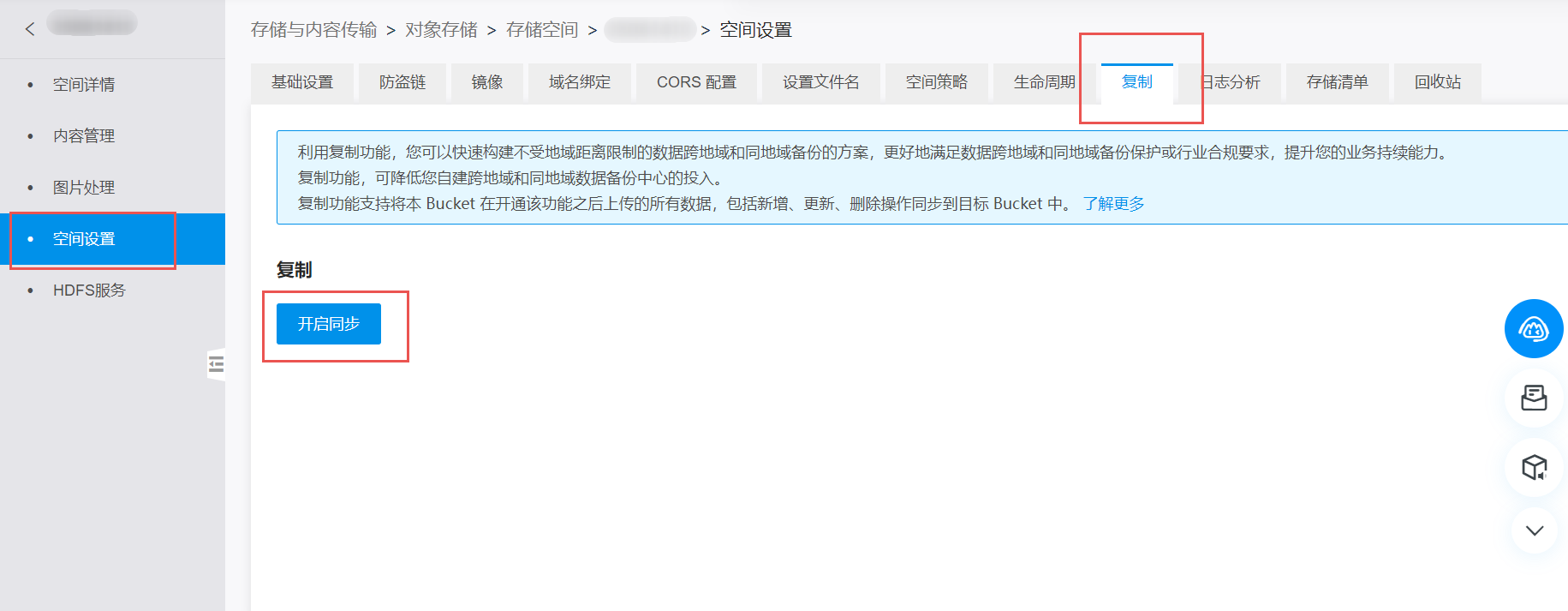 4. 单击空间设置的复制页签,并单击【开启同步】按钮。