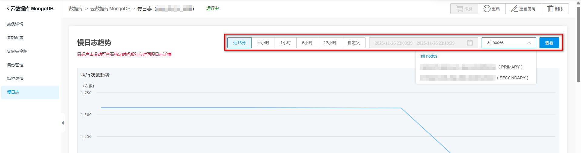 在慢日志趋势模块,可以选择时间周期和具体的实例节点查看该时段对应的慢日志执行次数。