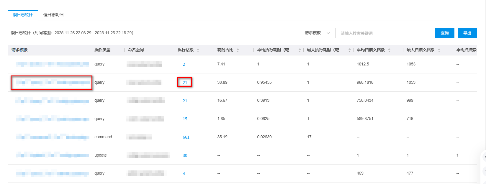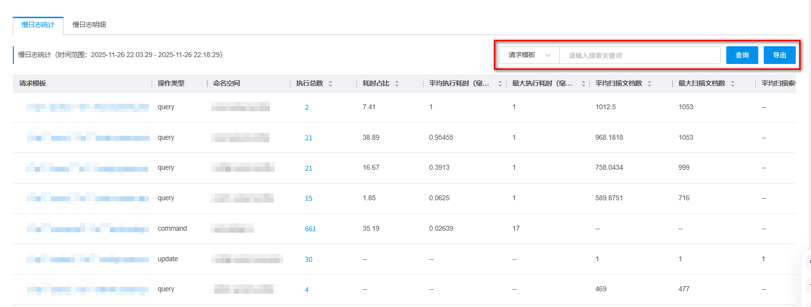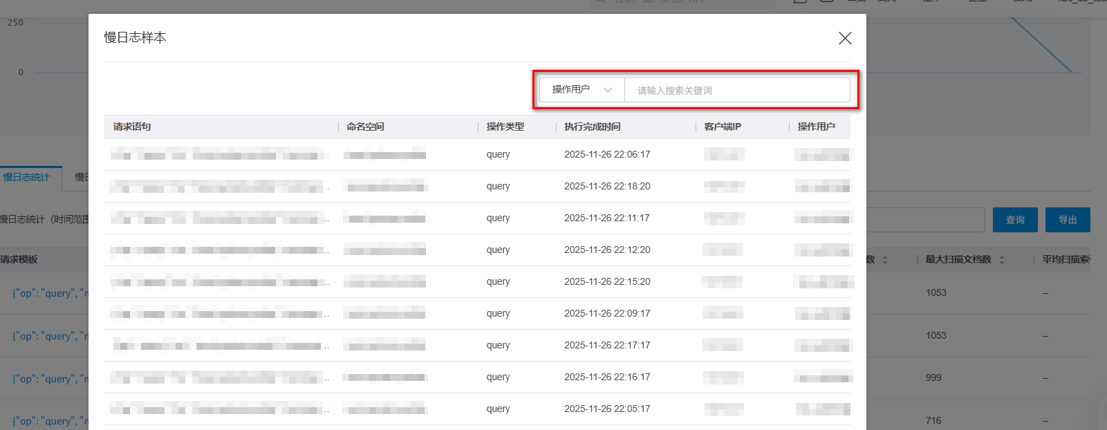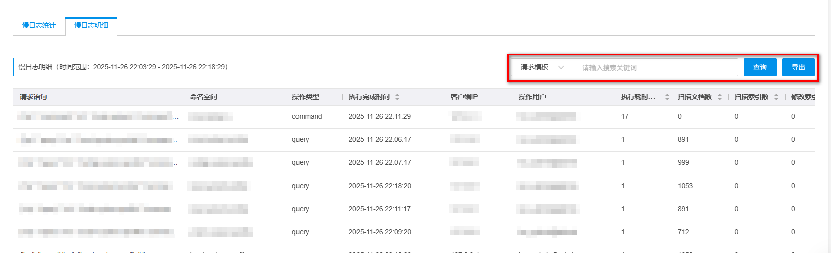 在页面下方慢日志统计模块,可以查看慢日志的统计信息,并支持按照请求模版、数据库、操作用户、客户端IP、操作类型进行筛选,单击导出,可将慢SQL统计表以CSV格式保存到本地计算机上。