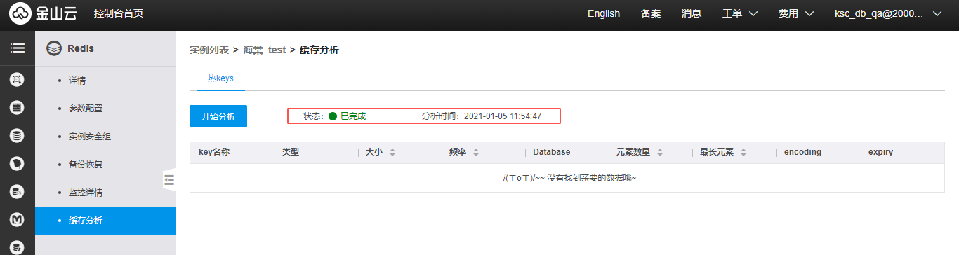 单击实例名称或者管理按钮,进入实例详情页,选中左侧缓存分析。