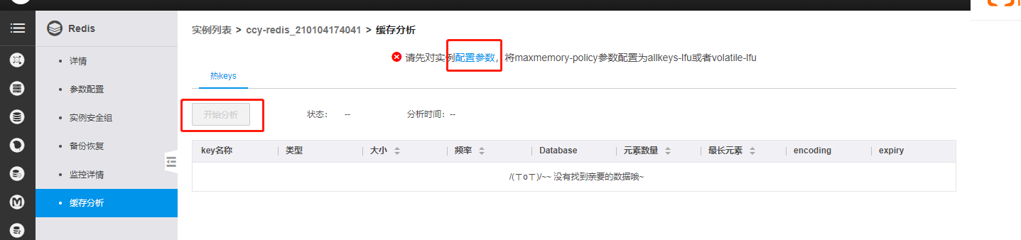 首次使用点击配置参数,将maxmemory-policy参数配置为allkeys-lfu或者volatile-lfu。