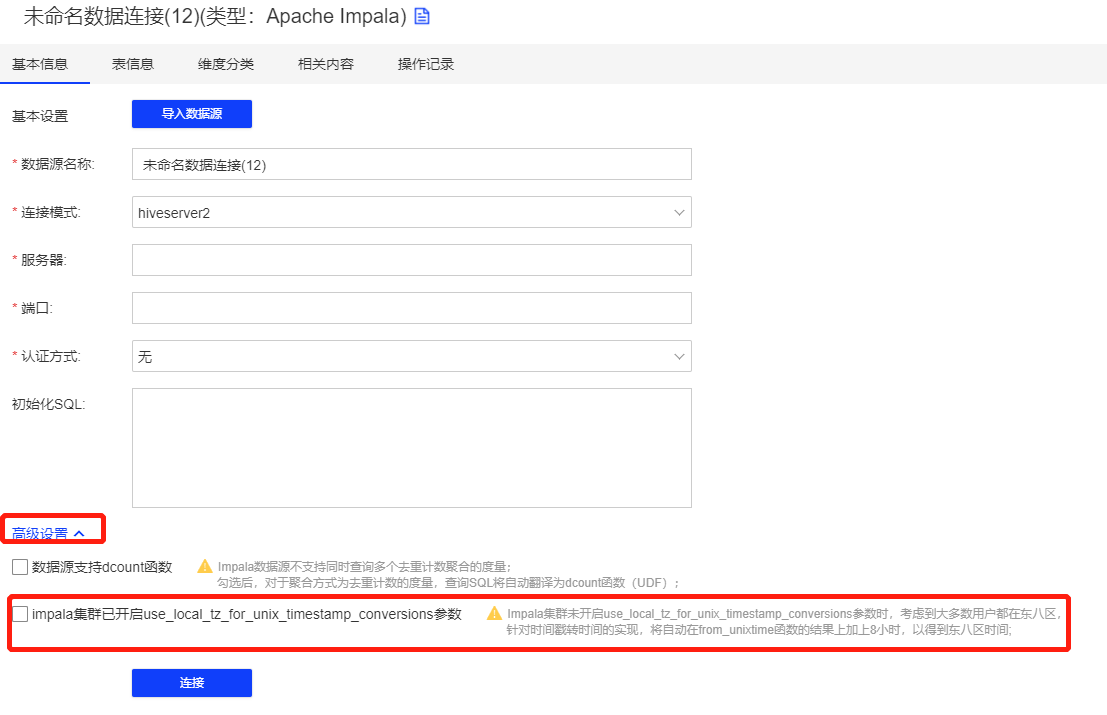 数据连接中选择impala数据源或猛犸数据源基本信息>高级设置,新增是否开启use_local_tz_for_unix_timestamp_conversions参数。