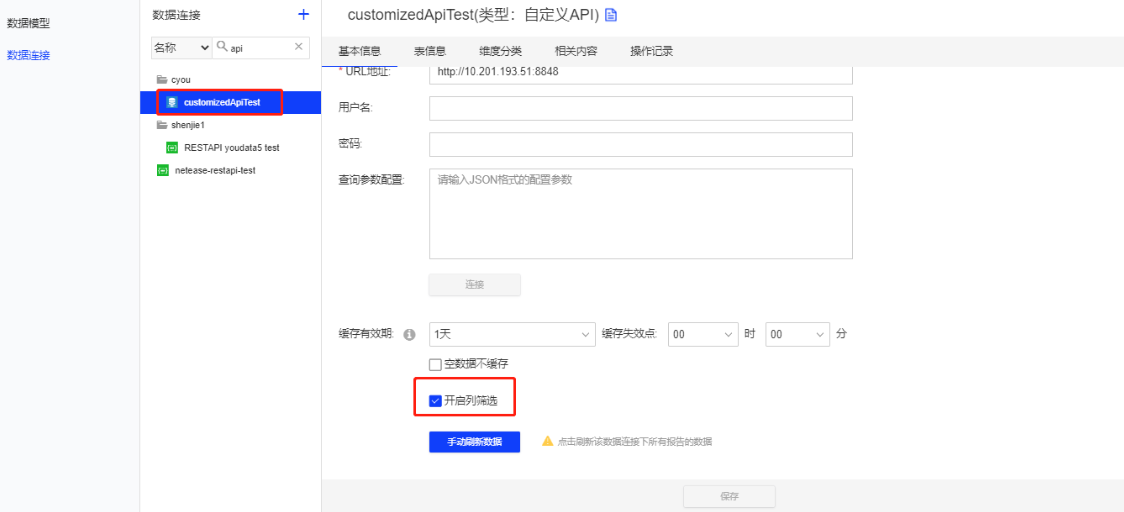 在连接自定义API类型的数据时,可选择开启列筛选,则数据不会全部导入,在使用时导入所需要的列,提高查询及使用性能。