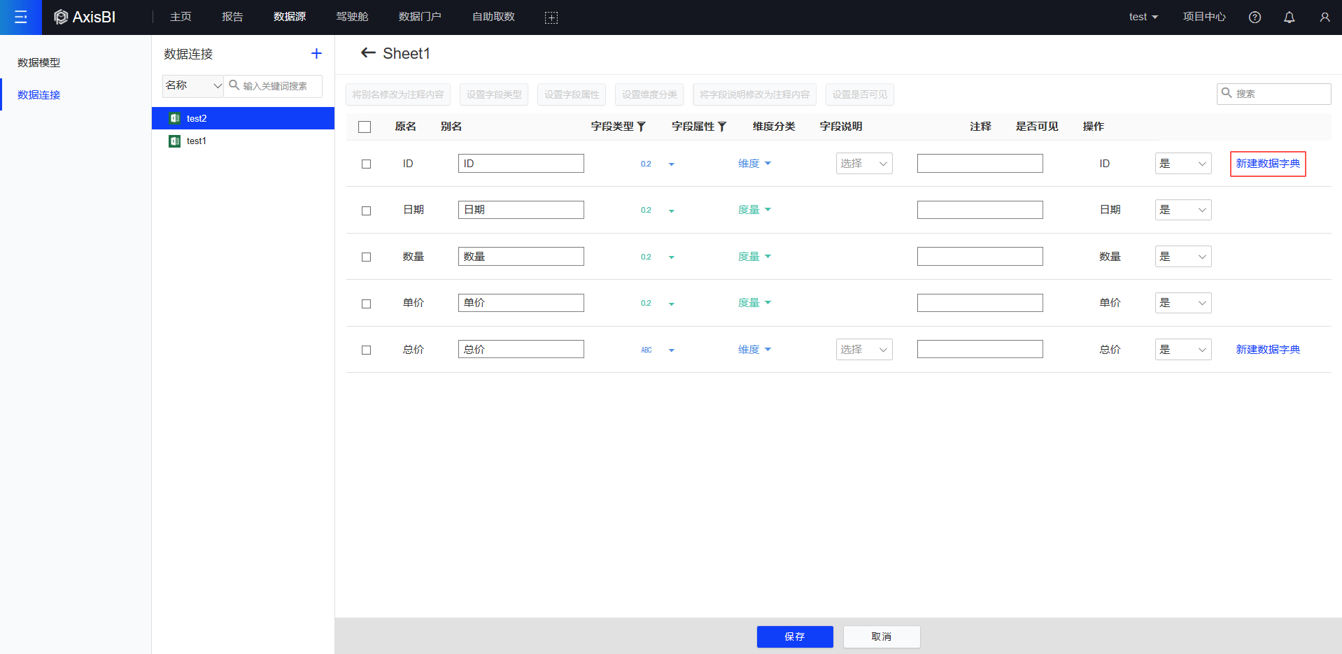 入口:数据连接>表信息>字段设置>操作>新建数据字典