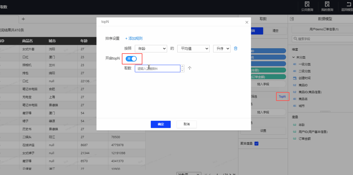 开启topN,可输入n,取前n项;关闭后则默认按排序规则排序,取全量数据。