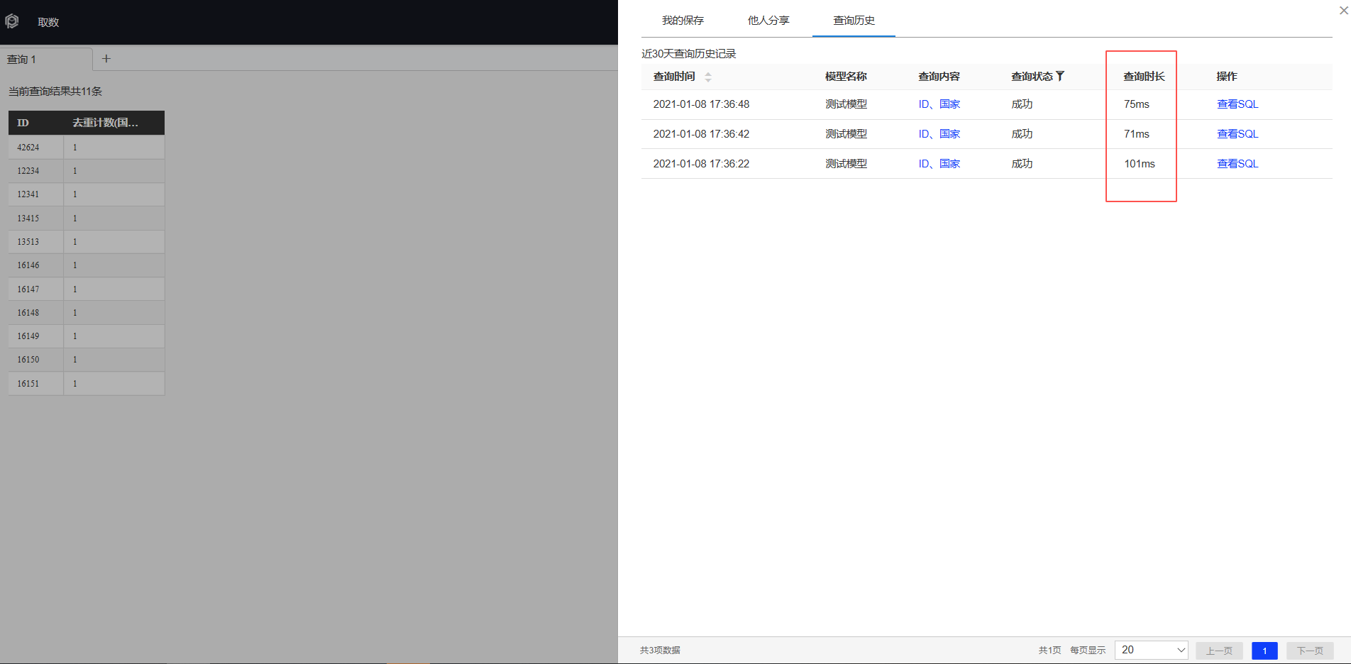 点开我的查询,新增查询时长,可直观的看到所抽取的数据查询耗时。