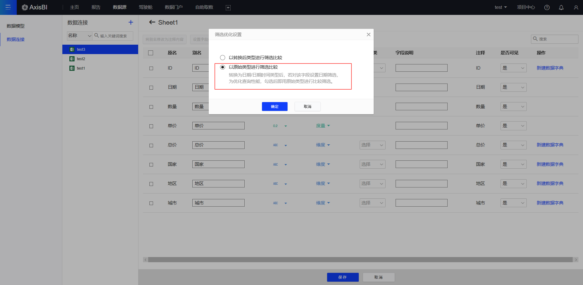 将字符串转换为日期、日期时间类型时,在日期筛选中可选择用原始类型进行比较,使用原始类型进行比较不需要再次转换,提高查询性能。