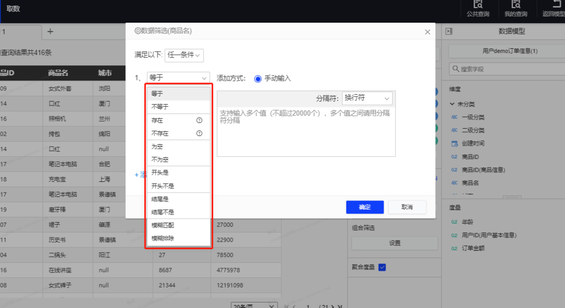 查询时,字段筛选和组合筛选中进行字符串类型筛选,可选择“开头是、开头不是、结尾是、结尾不是、模糊匹配、模糊排除”筛选所需要的数据,同时支持输入多个值。