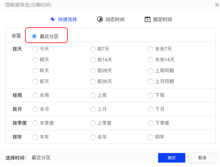 若数据源中数据属性有分区项时,产品支持在自助取数时按最近分区筛选,可快速查找到所需要的数据