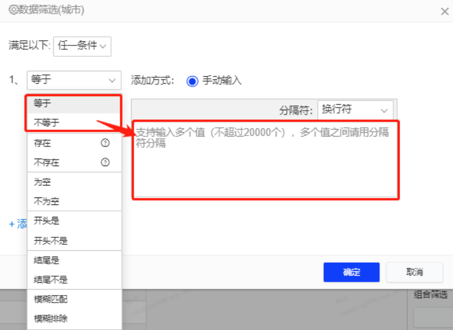 选择等于/不等于条件时,限制最多20000个值(换行符、英文逗号分隔)。