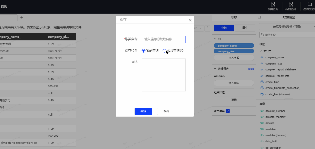 1) 取数后保存查询结果,可选择公共查询及我的查询,保存在公共查询时,拥有该模型权限的其他成员均可见该查询。