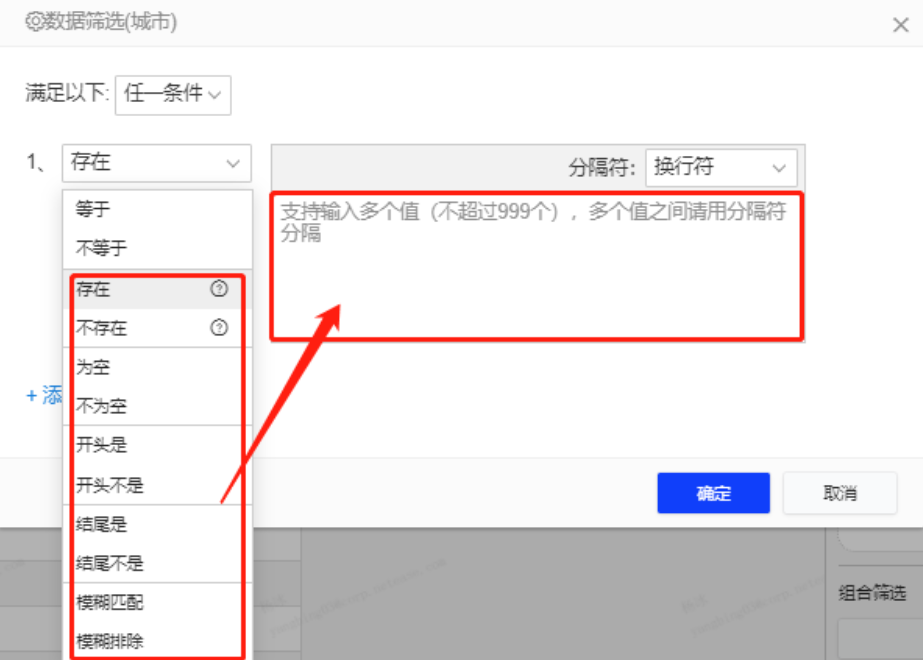 选择存在/不存在、开头是/开头不是、结尾是/结尾不是、模糊匹配/模糊排除时,限制最多999个值(换行符、英文逗号分隔)。