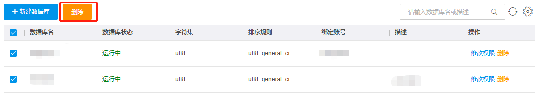 在数据库管理页面,点击对应数据库操作栏的删除按钮,弹出删除数据库窗口。