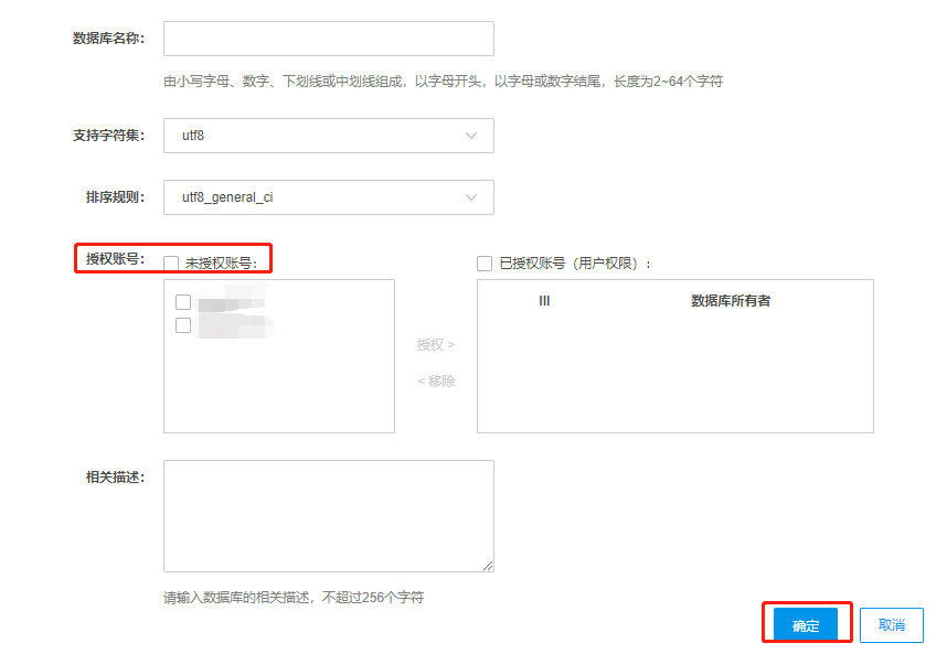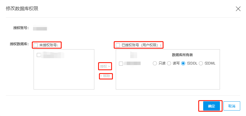 注意:数据库权限栏显示的为账号管理中创建的普通账号。