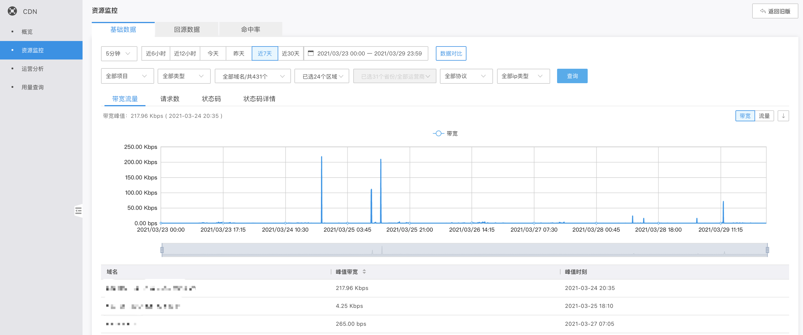 资源监控包括服务数据、回源数据、命中率,通过资源监控,您可以查看到CDN的运行情况