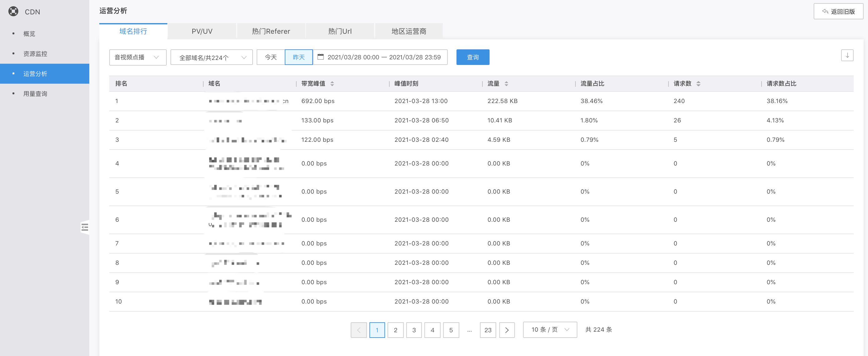 运营分析包括域名排行、PV/UV、热门Refer、热门URL、地区和运营商。