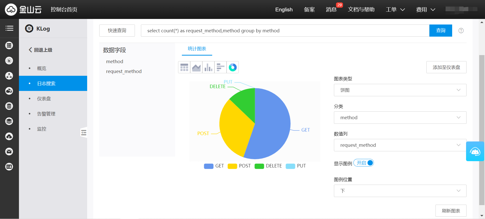 请求方法占比:下图展示本月内各请求方法的占比情况,所关联的查询分析语句如下: